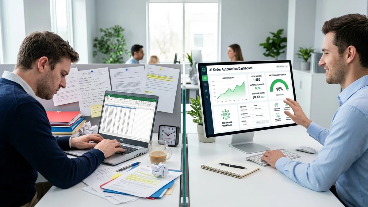 Monday, 8:47 AM. Your inbox: 53 new orders from the weekend. Fourteen are structured PDFs with SKU codes. The other 39 are a mix of plain-text emails, one photo of a handwritten list, and three that just say "same as last time, double the brass fittings."